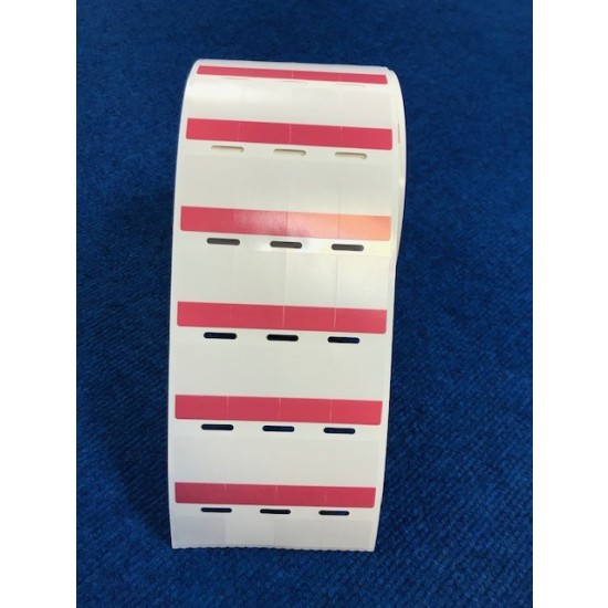The thermal transfer self-laminating adhesive label is made of vinyl and is supplied on a roll with 4 labels per row. The label has a Red colored print-on area 0.75" (19.1 mm) high for Category 6 FTP, Category 6a (10 Gig) UTP, Category 6e (10 Gig) FTP, 8 - 4 AWG wires, and a clear overlaminate. It is 1.0" wide and 2.25" long (25.4 x 57.15 mm) with a 3.0" (76.2 mm) core.Panduit -S100X225VHTY