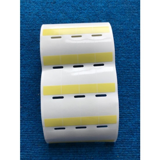The thermal transfer self-laminating adhesive label is made of vinyl and is supplied on a roll with 4 labels per row. The label has a Yellow colored print-on area 0.75" (19.1 mm) high for Category 6 FTP, Category 6a (10 Gig) UTP, Category 6e (10 Gig) FTP, 8 - 4 AWG wires, and a clear overlaminate